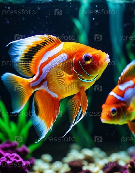 Красочные рыбы плавают изящно в хорошо освещенном аквариуме. Танк украшен кораллом, растениями и гравием, создавая яркую подводную сцену. Подводный мир. Аквариумы как хобби. генерируемый