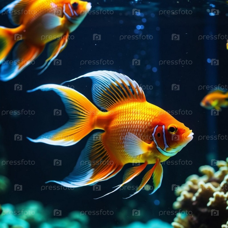 Красочные рыбы плавают изящно в хорошо освещенном аквариуме. Танк украшен кораллом, растениями и гравием, создавая яркую подводную сцену. Подводный мир. Аквариумы как хобби. генерируемый