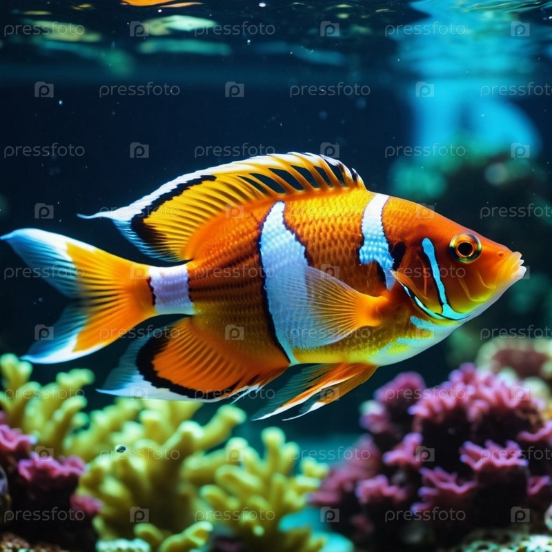 Красочные рыбы плавают изящно в хорошо освещенном аквариуме. Танк украшен кораллом, растениями и гравием, создавая яркую подводную сцену. Подводный мир. Аквариумы как хобби. генерируемый