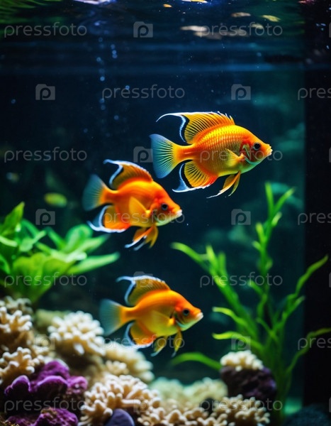 Красочные рыбы плавают изящно в хорошо освещенном аквариуме. Танк украшен кораллом, растениями и гравием, создавая яркую подводную сцену. Подводный мир. Аквариумы как хобби. генерируемый