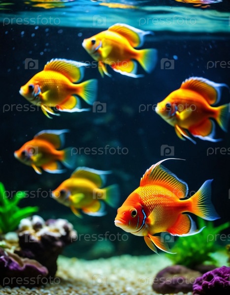 Красочные рыбы плавают изящно в хорошо освещенном аквариуме. Танк украшен кораллом, растениями и гравием, создавая яркую подводную сцену. Подводный мир. Аквариумы как хобби. генерируемый