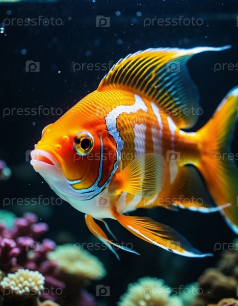 Красочные рыбы плавают изящно в хорошо освещенном аквариуме. Танк украшен кораллом, растениями и гравием, создавая яркую подводную сцену. Подводный мир. Аквариумы как хобби. генерируемый