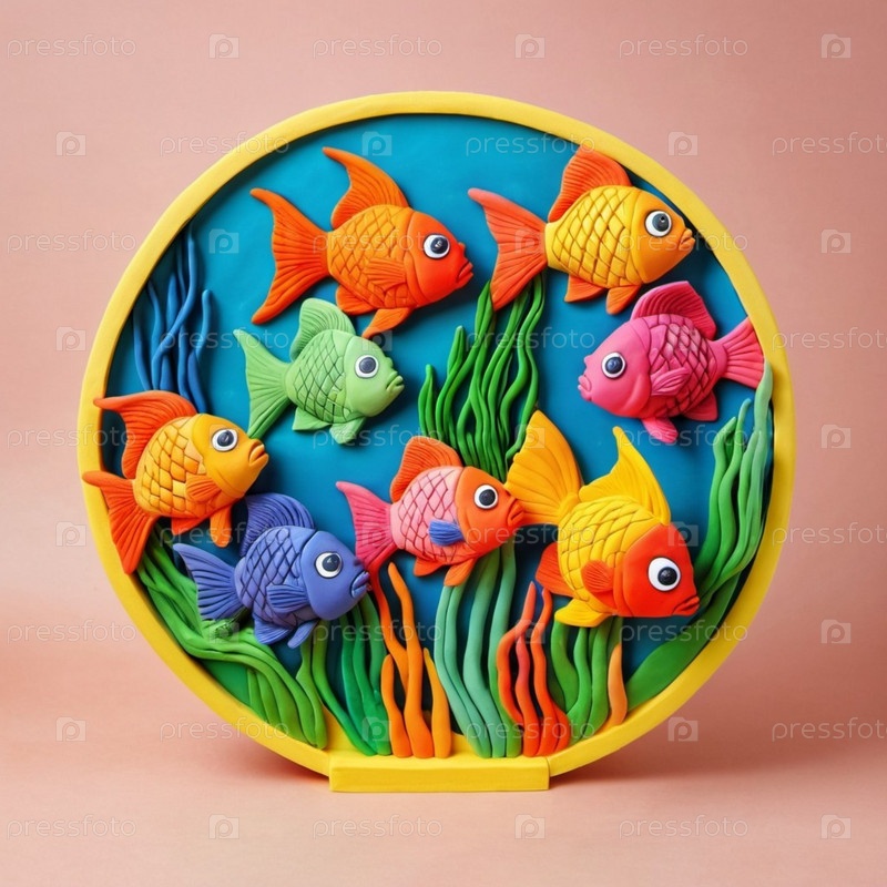 Аквариум как хобби. Красочный подводный пейзаж с рыбой и водорослями. Рыбы бывают разных оттенков оранжевого, фиолетового и желтого. Аквариум или глубокое море. Детская фотография. ИИ. Пластиковая рыба