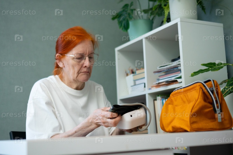 Руки пожилой женщины тщательно помещают монитор артериального давления в небольшую сумочку или футляр после использования. Закрытие на руках и действие по хранению