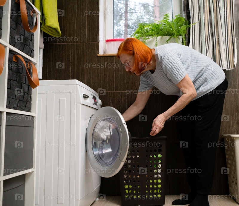 Зрелая женщина выполняет обычную домашнюю работу по загрузке стиральной машины с одеждой в своей домашней ванной комнате