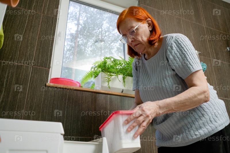 Низкий угол зрения пожилой женщины, добавляющей стиральный порошок