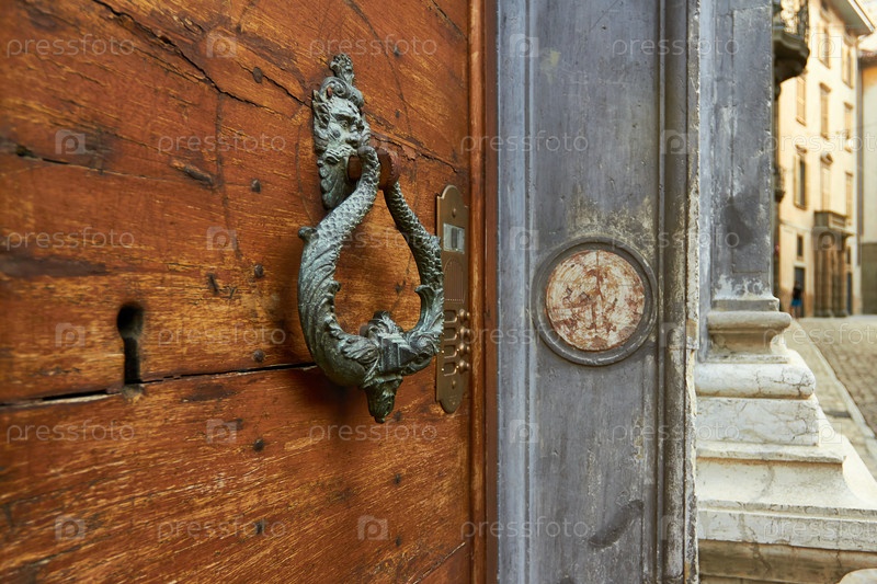 Старинная деревянная дверь с кованым дверным молоточком
