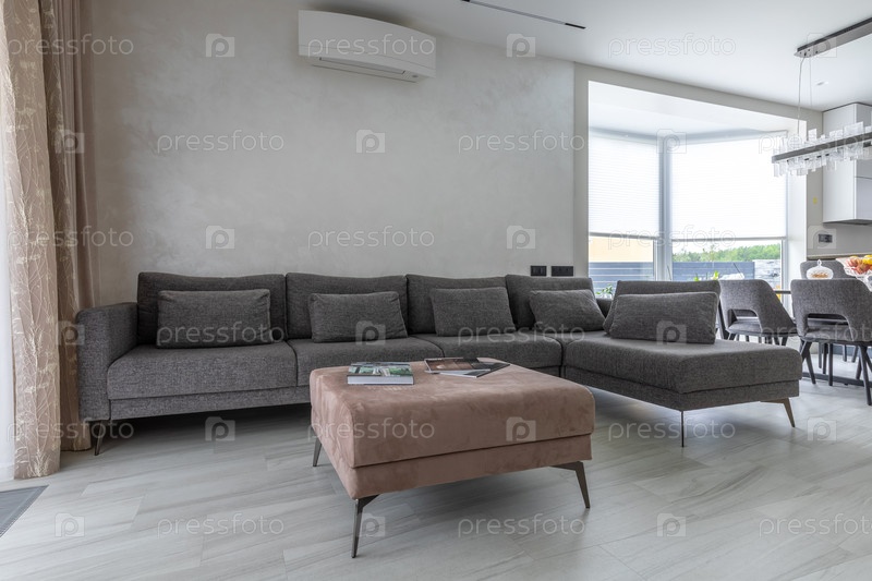 Просторный интерьер гостиной открытого плана с большим серым секционным диваном, бежевым османом и обеденным столом. Современный дизайн квартиры с минималистским декором, нейтральными стенами, большими окнами и ярким естественным освещением