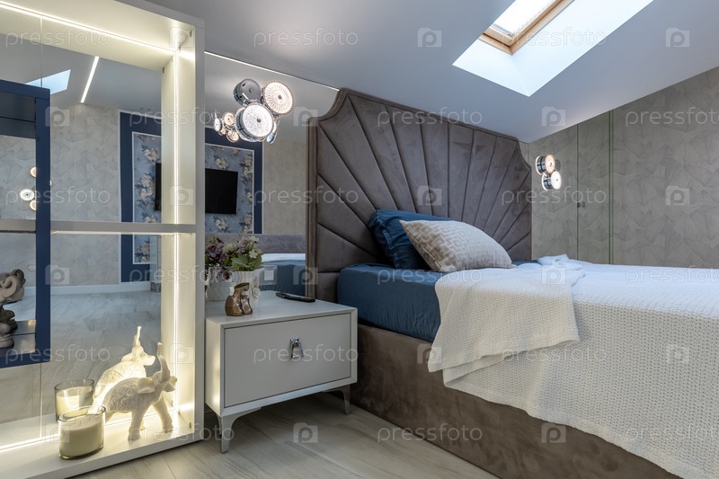 Современная мансардная спальня с большой кроватью с бархатным изголовьем, зеркальной стеной, отражающей стильную люстру, цветочные обои и естественный свет от наклонного окна потолка