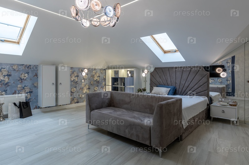 Широкий вид на интерьер современной главной спальни в мансардном пространстве, с большой кроватью с развевающимся изголовьем, плюшевым серым диваном, интегрированным зеркальным хранилищем и элегантными цветочными обоями