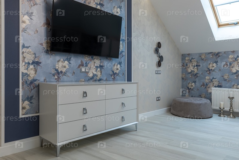 Внутренний вид современной спальни на чердаке с минималистским белым шестидверным комодом с хромированными ручками, большим телевизором с плоским экраном, установленным на синей цветочной акцентной стене, и элегантным серым напольным покрытием