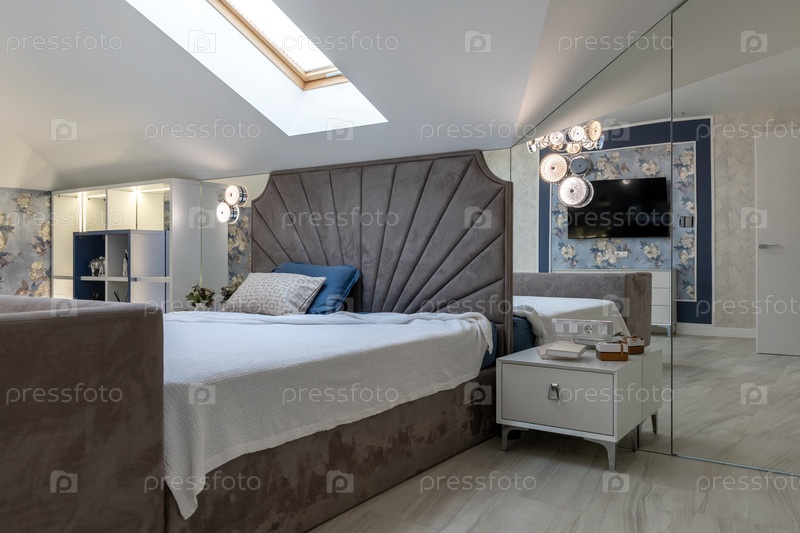 Элегантная главная спальня на чердаке с большой кроватью с бархатным флейтовым изголовьем, зеркальная стена полной высоты, отражающая комнату, цветочные обои и яркий световой люк