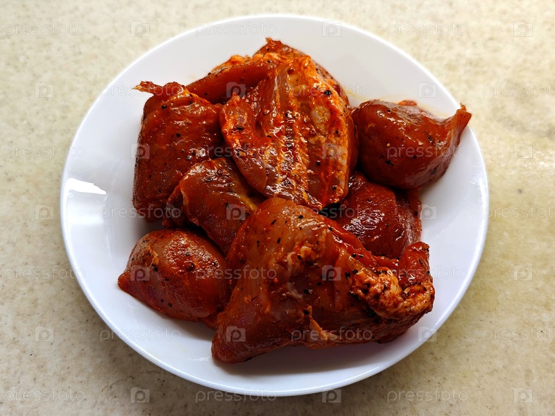 Купить мясо свинины, маринас, шашлык. Куски мяса в маринаде для барбекю или гриля на белой тарелке