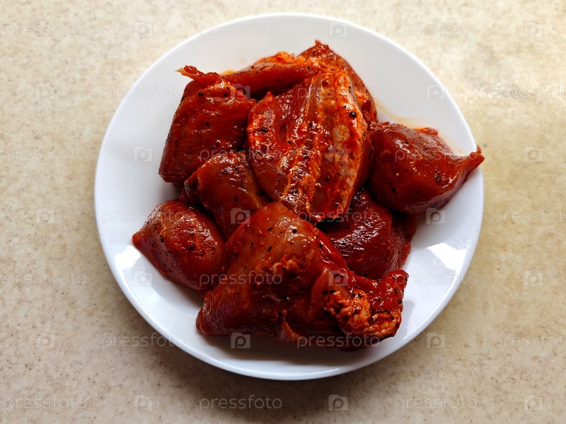 Купить мясо свинины, маринас, шашлык. Куски мяса в маринаде для барбекю или гриля на белой тарелке
