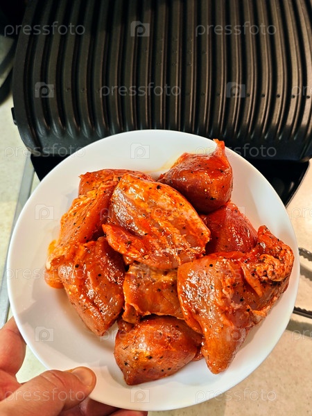 Купить мясо свинины, маринас, шашлык. Куски мяса в маринаде для барбекю или гриля на белой тарелке