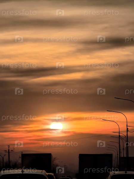 Закат с оранжевыми и желтыми оттенками. Видны силуэты уличных фонарей и верхушки грузовиков