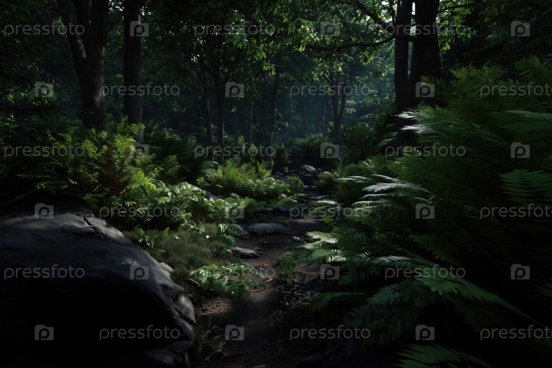 Глубокий лес ранним утром с папоротниками и камнями