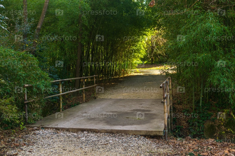 Мост в парке с бамбуковым лесом на фоне