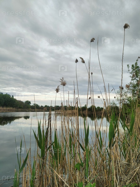 Озеро с тростником и облачным небом, естественный фон, спокойные обои