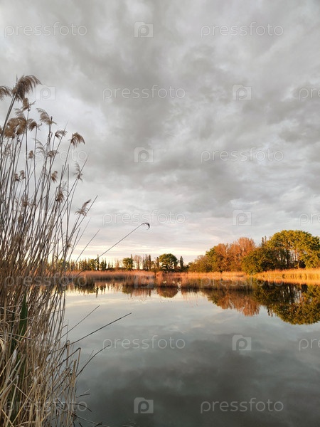 Озеро с тростником и облачным небом, естественный фон, спокойные обои