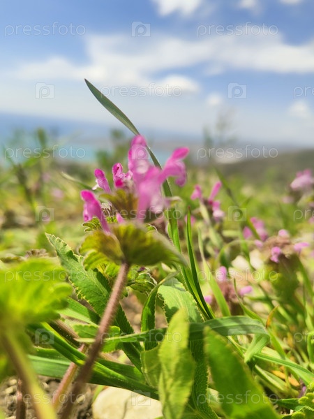 Макро розовых полевых цветов и зеленой травы, весенний естественный фон, цветочные обои
