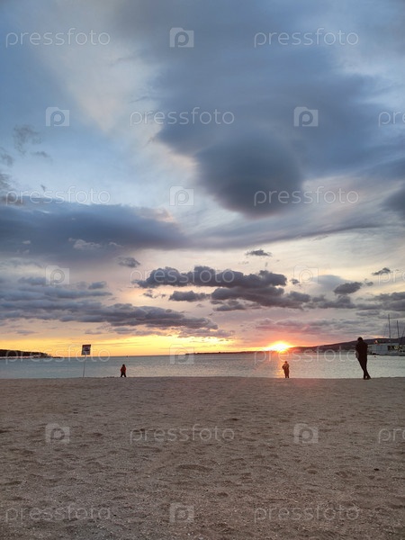 Закат на пляже, море, облака и силуэты, атмосферный фон, вечерние обои