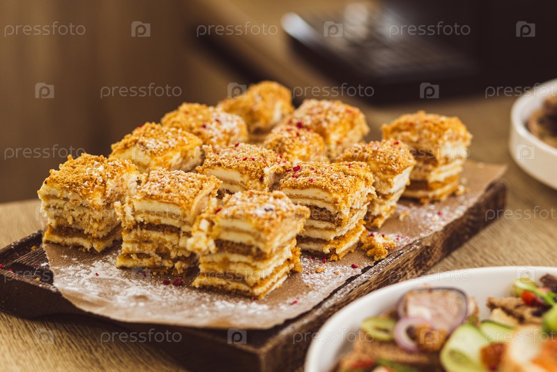 Нарезанный слоистый медовый торт со сливками и порошкообразным сахаром на деревянной доске. Сладкие десертные кондитерские изделия нарезают небольшими порциями для столовой или вечеринки