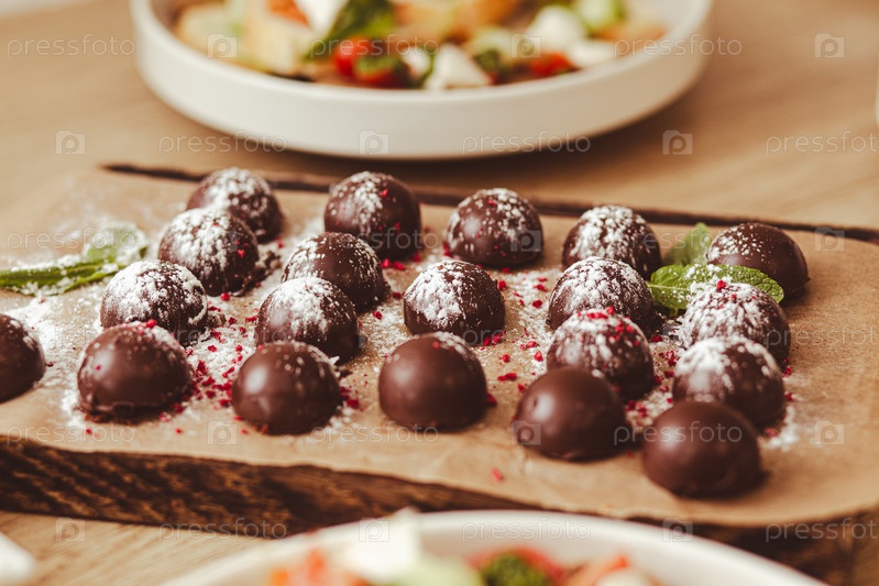 Крупный план самодельных шоколадных трюфелей, запыленных порошкообразным сахаром и листьями мяты на деревянной доске. Сладкие десертные конфеты подаются на пергаментной бумаге на мероприятии общественного питания или столе для буфета