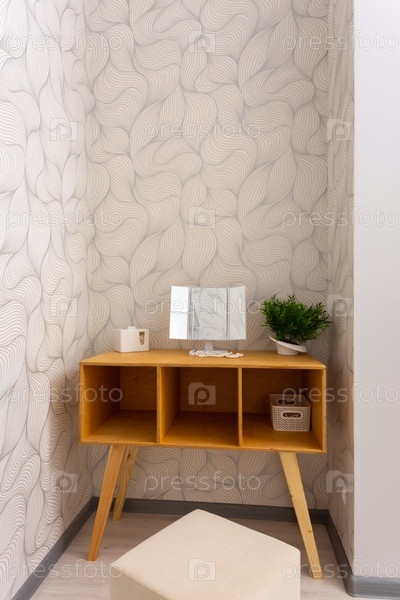 Минимальный угол тщеславия с деревянной консолью, зеркалом, стулом и небольшим растением на узорчатых обоях. Яркая современная гардеробная зона для макияжа, красоты и организации дома