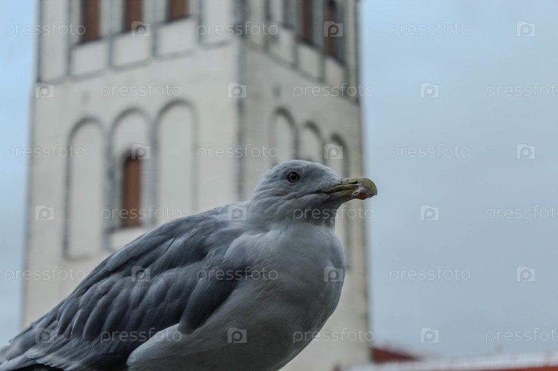 Серебристая чайка на фоне Церкви Святого Олафа