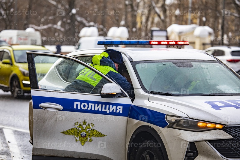 Инспектор ДПС ГИБДД у патрульного автомобиля в Москве зимой