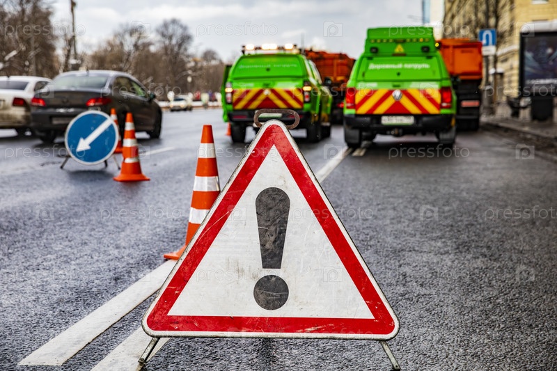Предупредительный дорожный знак и конусы на городской дороге