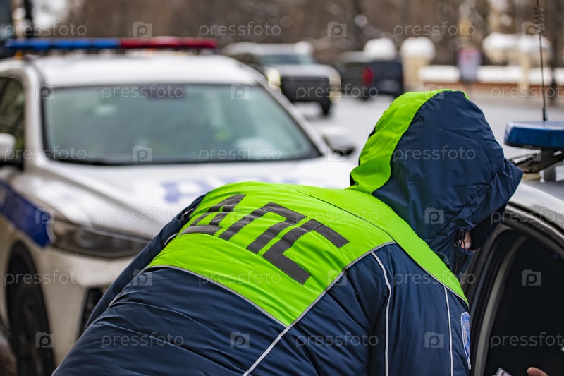 Инспектор ДПС ГИБДД у патрульного автомобиля в Москве зимой