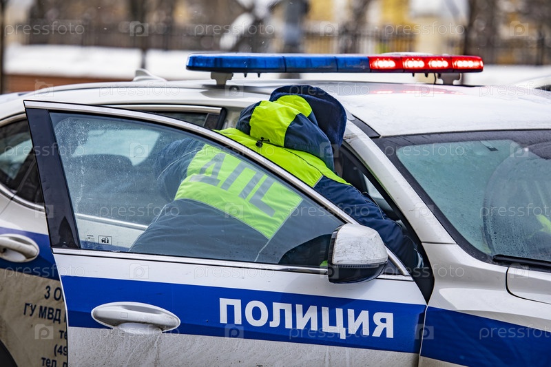 Инспектор ДПС ГИБДД у патрульного автомобиля в Москве зимой