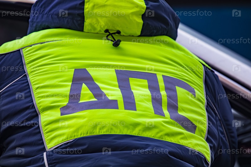 Инспектор ДПС в сигнальном жилете со светоотражающей надписью