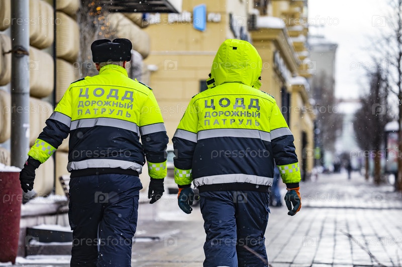 Сотрудники ЦОДД на зимней городской улице во время снегопада