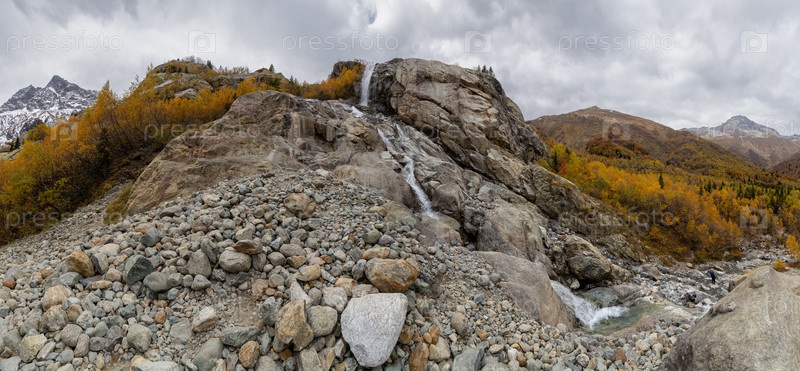 Панорама крутого утеса и водопада Алибек, одного из самых мощных и высоких каскадов в Домбае, заповеднике Теберда, горах Северного Кавказа. Образовано падением реки Джаловчатки