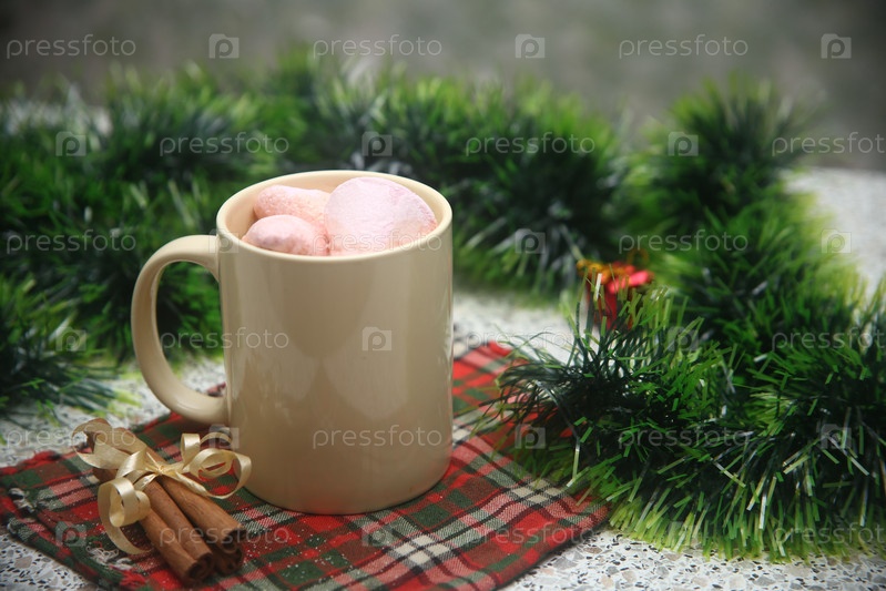 Чашка кофе с зефиром и корицей на столе