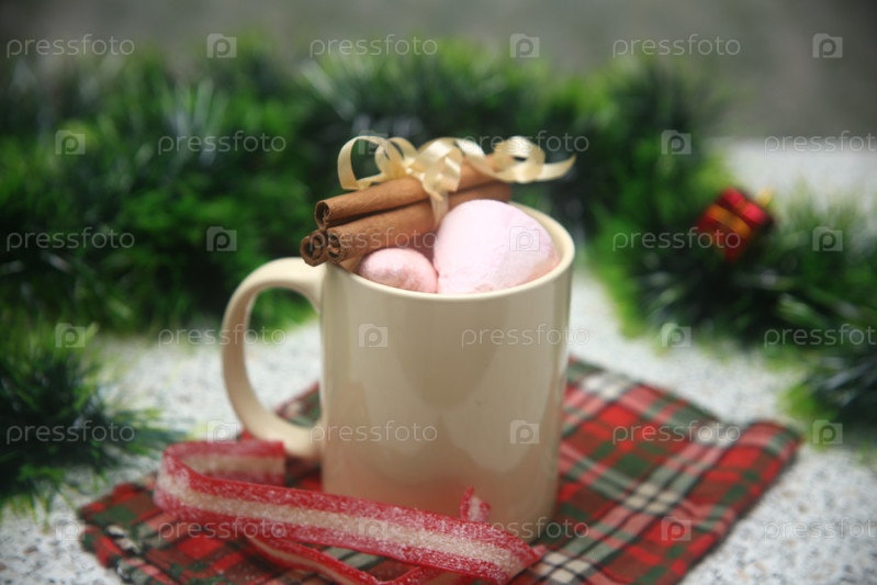 Чашка кофе с зефиром и корицей на столе