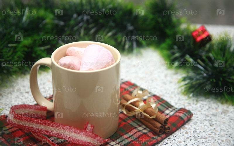Кофе с корицей и зефиром на столе. Кулинария и напитки. Вид крупным планом