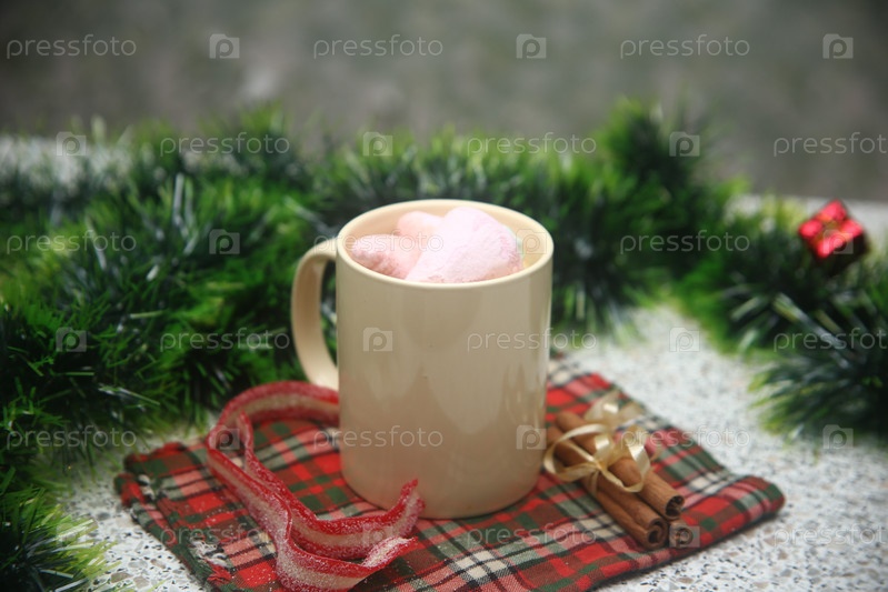 Чашка кофе с зефиром и корицей на столе