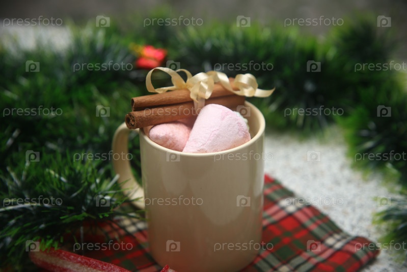 Чашка кофе с зефиром и корицей на столе