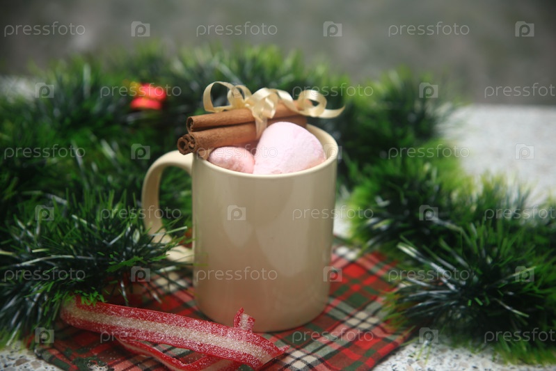 Чашка кофе с зефиром, мармеладом и корицей на столе