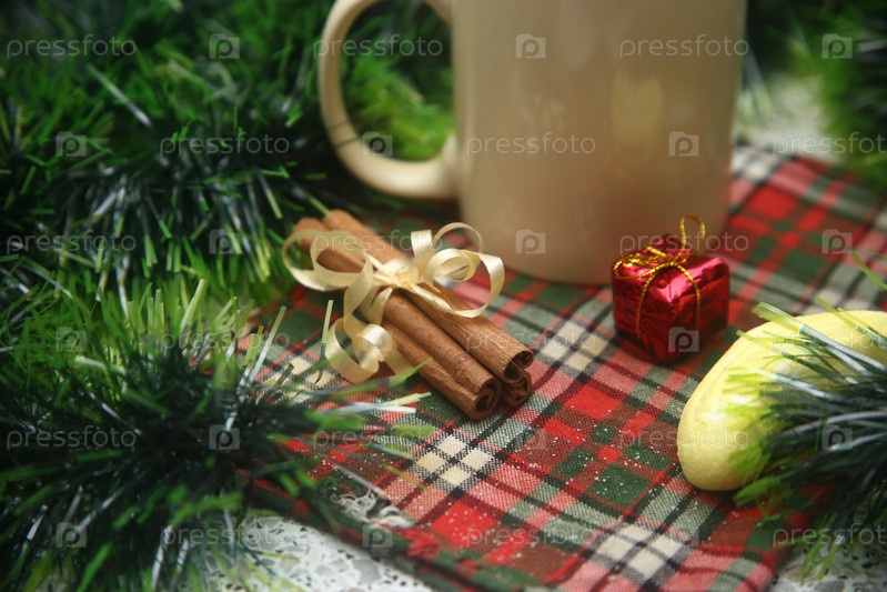 Чашка кофе с корицей и мишурой на столе. Кулинария и напитки. Вид крупным планом