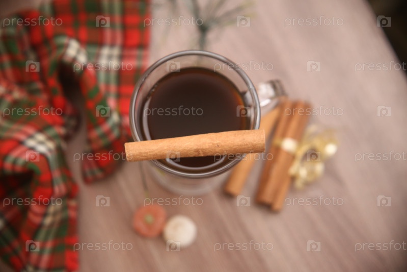Чашка черного кофе с корицей и мармеладом на столе