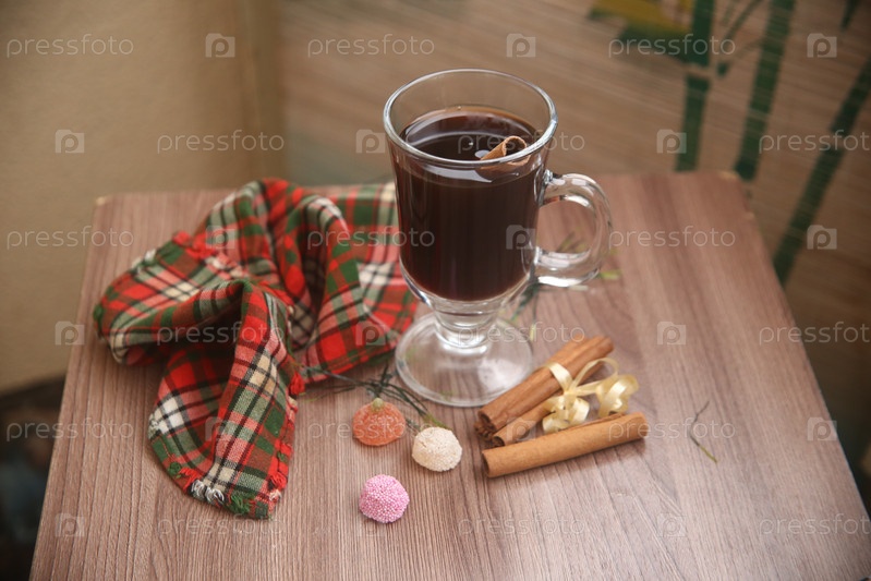 Чашка черного кофе с корицей и мармеладом на столе