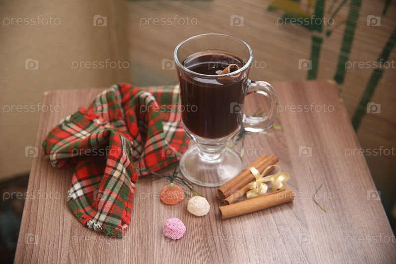 Чашка черного кофе с корицей и мармеладом на столе