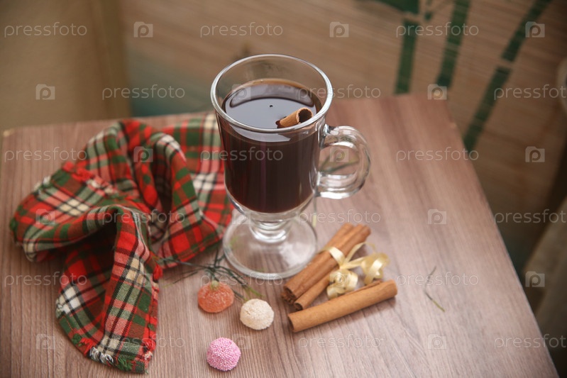 Чашка черного кофе с корицей и мармеладом на столе