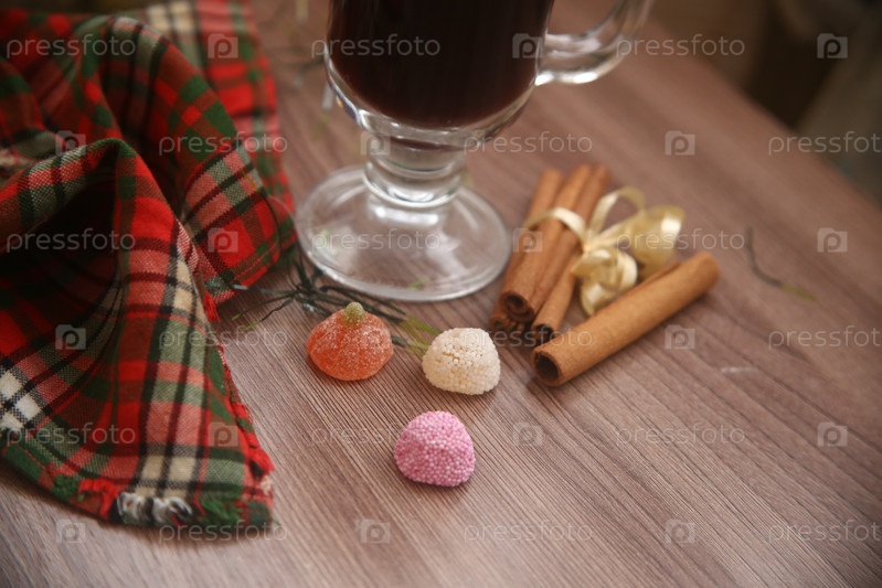 Чашка черного кофе с корицей и мармеладом крупным планом