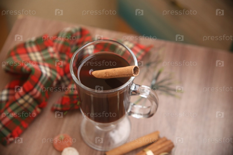 Чашка черного кофе с корицей на столе. Вид сверху